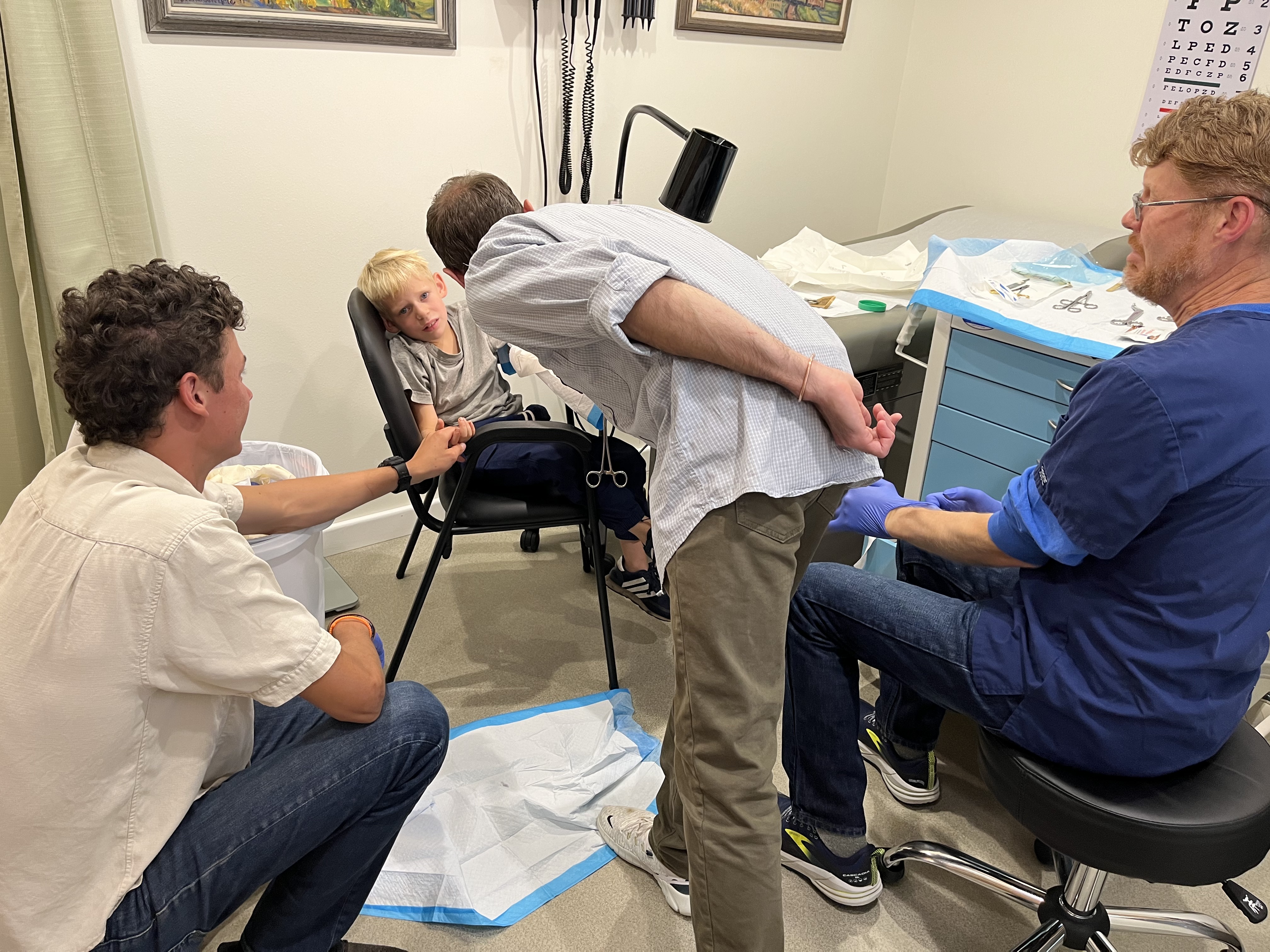 Such a classic photo of the doctors at work. Brave patient Zeb closed his new birthday knife blade over his thumb nail. Dr. Uncle Marshal removed the nail and sewed everything back together while the surgeon, Dr. Uncle Seth, and Whit, the medical student, gave support care.